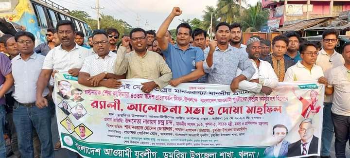 এর আগে বিকেলে ডুমুরিয়া উপজেলা যুবলীগের উদ্যোগে আহ্বায়ক প্রভাষক গোবিন্দ ঘোষ এর সভাপতিত্বে আলোচনা সভা ও র্যালী অনুষ্ঠিত হয়।