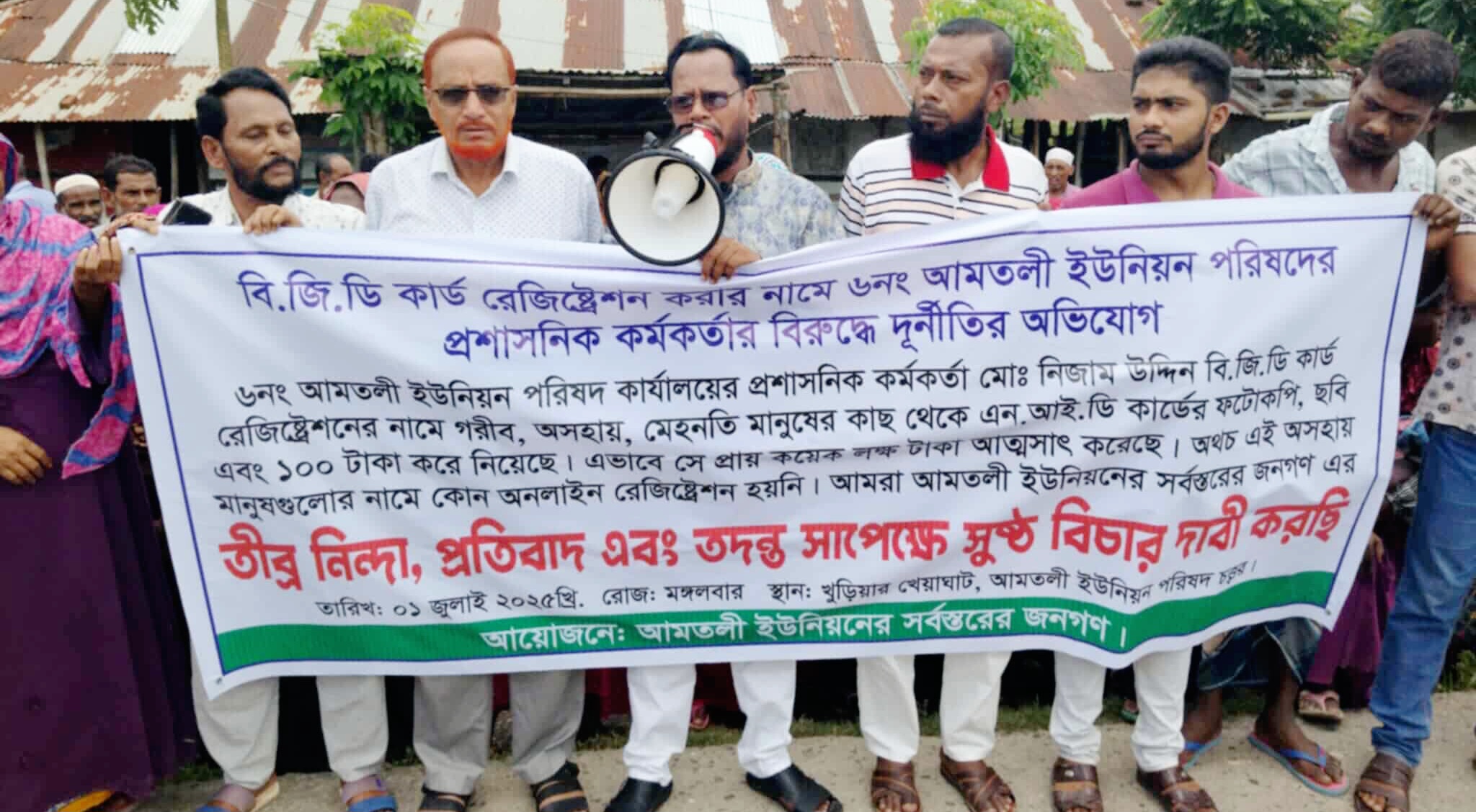 মহিবউল্লাহ কিরন, বরগুনা: বরগুনার আমতলীতে অসহায় দুস্থ দরিদ্র হতদরিদ্রদের ভিজিডি কার্ডের অনলাইন রেজিষ্টেশন করার নামে আমতলী সদর ইউনিয়ন পরিষদের প্রশাসনিক কর্মকর্তার দূর্ণীতির বিরুদ্ধে মানববন্দন ও বিক্ষোভ মিছিল হয়েছে।