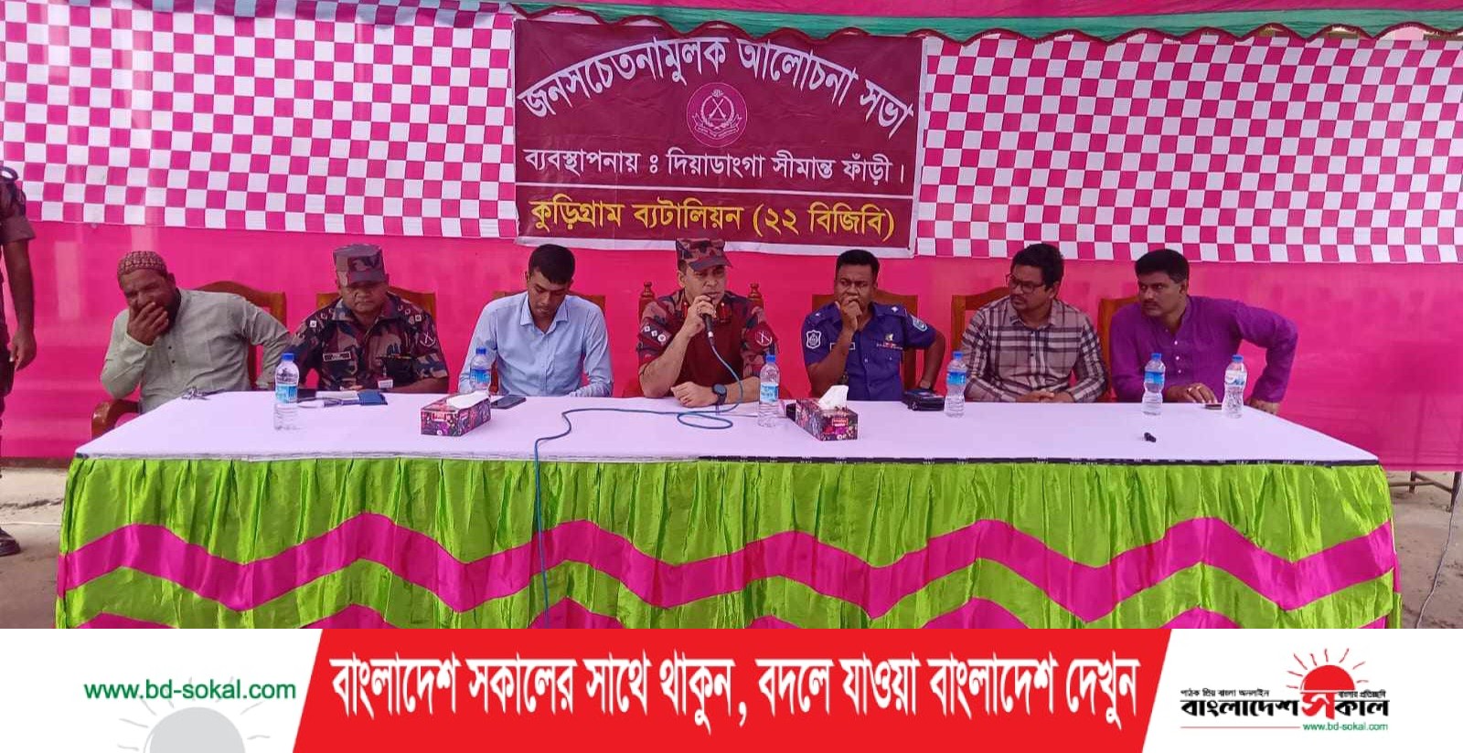 উক্ত জনসচেতনতামূলক সভায় কুড়িগ্রাম ব্যাটালিয়ন (২২ বিজিবি) এর অধীনস্থ দিয়াডাংগা বিওপি’র ব্যবস্থাপনায় কুড়িগ্রাম ব্যাটালিয়ন (২২ বিজিবি) এর অধিনায়ক মোঃ আব্দুল মোত্তাকিম, এসপিপি, পিএসসিজি, সভাপতিত্বে সভায় উপস্তিত ছিলেন সহকারী কমিশনার (ভূমি) ভারপ্রাপ্ত এ্যাডজুটেন্ট সহকারী পরিচালিক মোঃ ইউনুছ আলী, , ভূরুঙ্গামারী থানার অফিসার ইনচার্জ (তদন্ত) মোঃ আজাহার আলী, পাথরডুবি ইউপি চেয়ারম্যান আব্দুস সবুর, শিলখুড়ি ইউপি চেয়ারম্যান মোঃ আসাদুজ্জামান, তিলাই ইউপি চেয়ারম্যান মোঃ কামরুজ্জামান সহ মেম্বার, প্রিন্ট ও ইলেকট্রনিক মিডিয়ার সাংবাদিকবৃন্দ, গণ্যমান্য ব্যক্তিবর্গ ও এলাকার সাধারণ জনগণ।