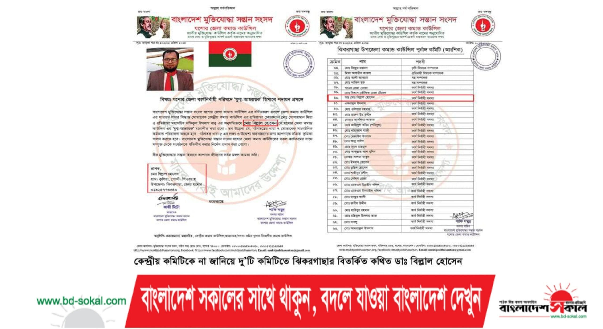 কেন্দ্রীয় কমিটিকে না জানিয়ে দু’টি কমিটিতে ঝিকরগাছার বিতর্কিত কথিত ডাঃ বিল্লাল হোসেন