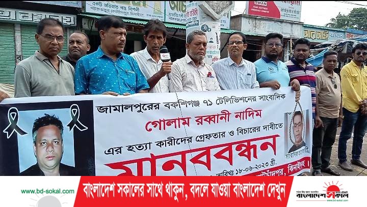 নিজস্ব প্রতিবেদক বাবলু মিয়া॥ জামালপুরের বকশীগঞ্জের বাংলা নিউজ ২৪ ও ৭১ টেলিভিশনের সাংবাদিক গোলাম রব্বানী নাদিম এর হত্যাকারীদের বিচারের দাবিতে মানববন্ধন করেছেন কোটচাঁদপুরে কর্মরত সাংবাদিক সমাজ। রবিবার সকাল ১০ টায় স্থানীয় বাজার চত্বরে এ মানববন্ধন করা হয়। জানা যায়, সম্প্রতি জামালপুরের বকসি্গঞ্জের বাংলা নিউজ ও ৭১ টেলিভিশনের সাংবাদিক গোলাম রব্বানী নাদিম কে দূবৃত্তরা হত্যা করেছেন।ওই ঘটনার পর সারাদেশের সাংবাদিক সমাজ প্রতিবাদের ঝড় তুলেছেন,সামাজিক যোগাযোগ মাধ্যমে, টেলিভিশন, অনলাইন ও পত্রিকায়।