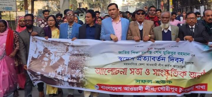 এ সময় গৌরীপুর উপজেলায় আওয়ামী লীগের নেতৃবৃন্দ সহ তৃণমূল আওয়ামী লীগের নেতাকর্মীরা উপস্থিত ছিলেন। পরে বেলা ২ ঘটিকায় উপজেলা আওয়ামী লীগ, ইউনিয়ন আওয়ামী লীগ ও সকল অঙ্গ ও সহযোগী সংগঠনের নেতাকর্মীদের নিয়ে স্বদেশ প্রত্যাবর্তন দিবস উপলক্ষে ময়মনসিংহ জেলা আওয়ামী লীগ কর্তৃক আয়োজিত আলোচনা সভা ও সাংস্কৃতিক অনুষ্ঠানে যোগদান করেন গৌরীপুর উপজেলায় আওয়ামী লীগের সাধারণ সম্পাদক সোমনাথ সাহা।