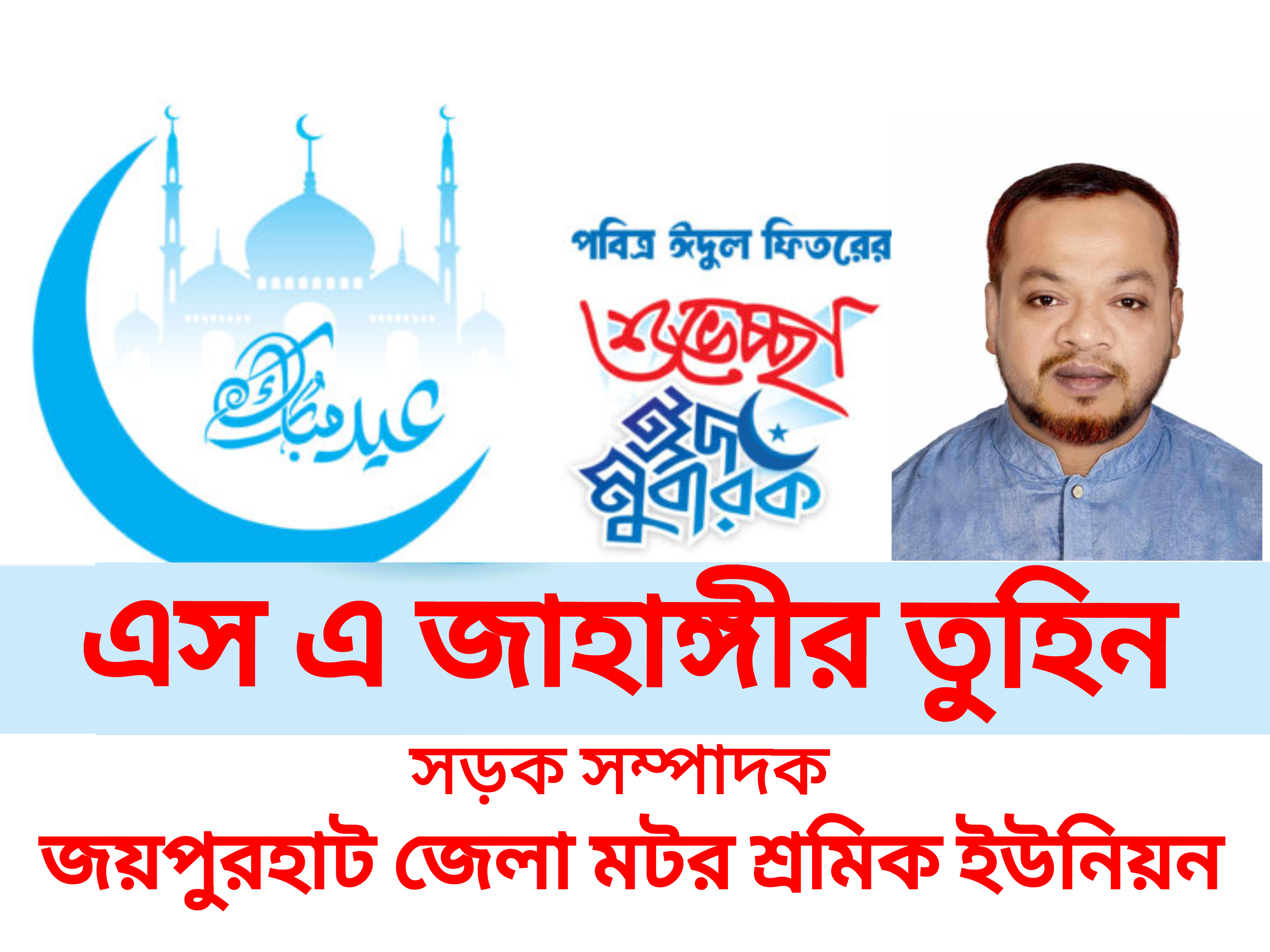 পবিত্র ঈদ উল ফিতর উপলক্ষ্যে জয়পুরহাট জেলা মটর শ্রমিক সদস্যসহ দেশবাসীকে ঈদের শুভেচ্ছা জানিয়েছেন জয়পুরহাট জেলা মটর শ্রমিক ইউনিয়নের সড়ক সম্পাদক এস এ জাহাঙ্গীর তুহিন।
