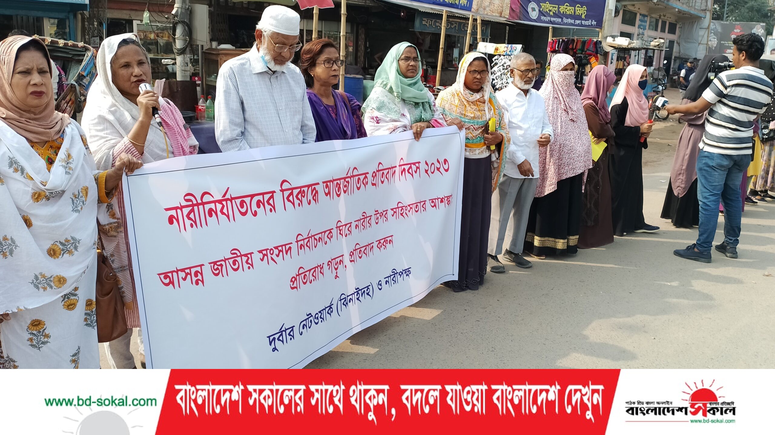 ঝিনাইদহ প্রতিনিধি : ঝিনাইদহে নারীনির্যাতনের বিরুদ্ধে আন্তর্জাতিক প্রতিবাদ দিবস পালিত হয়েছে। ঝিনাইদহ দূর্বার নেটওয়ার্ক ও নারীপক্ষের আয়োজনে শনিবার সকালে ওয়েলফেয়ার এফোর্টস (উই)’র কার্যালয় চত্বর থেকে একটি র্যালী বের করা হয়। র্যালীটি শহরের প্রধান প্রধান সড়ক প্রদক্ষিণ করে শহরের পায়রা চত্ত¡রে গিয়ে শেষ হয়। সেখানে অনুষ্ঠিত হয় মানববন্ধন।