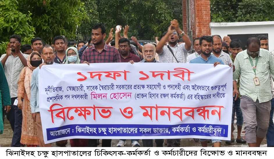 শেখ শফিউল আলম লুলু, ঝিনাইদহ: ঝিনাইদহ চক্ষু হাসপাতালের সহকারী পরিচালক মিলন হোসেন এর বহিস্কারের দাবীতে বিক্ষোভ মিছিল ও মানববন্ধন কর্মসূচী পালন করেছে হাসপাতালের চিকিৎসক-কর্মকর্তা ও কর্মচারীরা।