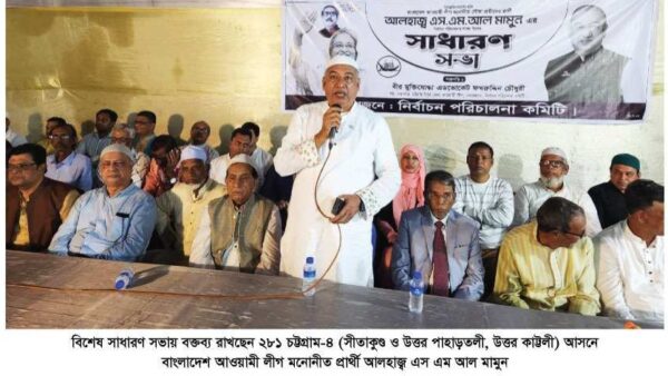 অদ্য ৭ ডিসেম্বর সন্ধ্যা ৬টায় চট্টগ্রাম-৪ আসনে বাংলাদেশ আওয়ামী লীগ মনোনীত প্রার্থী আলহাজ্ব এস এম আল মামুনের সমর্থনে এক বিশেষ সাধারণ সভা ছলিমপুর প্রার্থীর বাসভবনে অনুষ্ঠিত হয়।