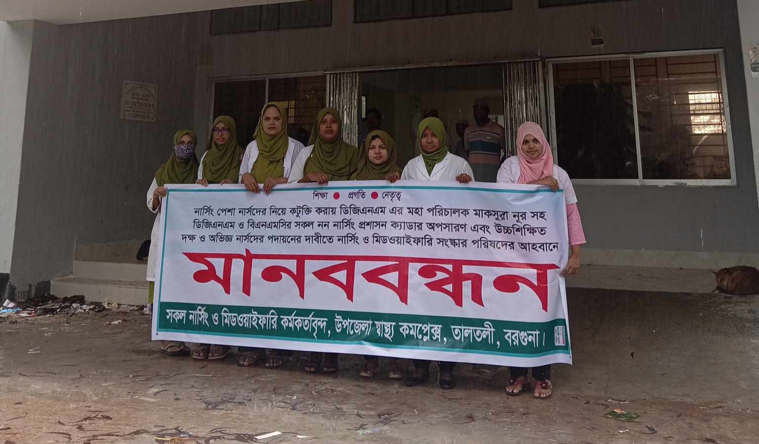 আজ ১৪ সেপ্টেম্বর বেলা ১১ টায় হাসপাতাল চত্বরে ঘন্টাব্যাপী মানববন্ধনে নার্সিং কর্মকর্তা সমন্বয়ক কারিমা বলেন, নার্সিং ও মিডওয়াইফারি অধিদপ্তর প্রতিষ্ঠার পর থেকে প্রশাসন ক্যাডারের বিভিন্ন কর্মকর্তারা দায়িত্ব পালন করলে ও তারা আজ পর্যন্ত যুগপোযোগী নিয়োগ বিধি, পদন্নোতি,বদলী সহজীকরণসহ কোন পদক্ষেপই গ্রহণ করতে পারেনি বরং নার্সরা বিভিন্ন সময় তাদের সমস্যা নিয়ে নার্সিং ও মিডওয়াইফারি অধিদপ্তরের মহাপরিচালকের কাছে গেলে তিনি কোন সমাধান না দিয়ে তাদের সাথে অপেশাদার আচরণ করেন। আমি মনে করি তিনি একজন ব্যর্থ মহাপরিচালক অনতিবিলম্বে তাহার সন্মানের সহিত পদত্যাগ করা উচিত।