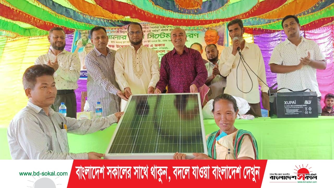 মোঃ মাসুদ রানা, খাগড়াছড়ি প্রতিনিধি॥ “পার্বত্য চট্টগ্রামের প্রত্যন্ত এলাকায় সোলার প্যানেল স্থাপনের মাধ্যমে বিদ্যুৎ সরবরাহ প্রকল্প-২য় পর্যায়” শীর্ষক প্রকল্পের আওতায় খাগড়াছড়ির মানিকছড়ি উপজেলার অনুন্নত ও দূর্গম জনপদ বাটনাতলী ইউনিয়নের বিদ্যুৎ সুবিধাবঞ্চিত ২৭১ পরিবারের মাঝে সৌর বিদ্যুৎ সোলার বিতরণ করা হয়েছে।