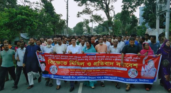 নিজস্ব প্রতিবেদক বাবলু মিয়া॥ ঝিনাইদহ কোটচাঁদপুরে উপজেলা আওয়ামী লীগ ও অঙ্গ সংগঠনের কর্তৃক আয়োজিত,রাজশাহী মহানগর বিএনপি নেতা কর্তৃক আওয়ামী লীগ সভাপতি মাননীয় প্রধানমন্ত্রী জননেত্রী শেখ হাসিনা’র হত্যার হুমকি’র প্রতিবাদে সোমবার বিকাল চারটার সময় বিক্ষোভ মিছিল ও সমাবেশ অনুষ্ঠিত হয়।