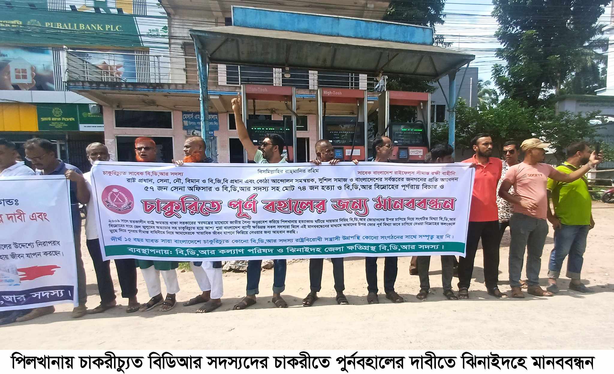 মানববন্ধন কর্মসুচিতে চাকরীচ্যুত সাবেক বিডিআর সদস্যদের পরিবার পরিজন ও সন্তানরা অংশ গ্রহন করেন। মানববন্ধন শেষে চাকরীচ্যুত বিডিআর সদস্যরা ঝিনাইদহ শহরে বিক্ষোভ মিছিল করেন। মিলিল শেষে শহরের পায়রা চত্বরে বক্তব্য রাখেন সাবেক বিডিআর সদস্য এবিএম কামরুজ্জামান, হাবিলদার মনিরুজ্জামান, মেডিকেল এ্যসিসটেন্ট মুরাদ আলী, ল্যান্স নায়েক আব্দুল কাদের ও সিপাহী আশরাফুল ইসলাম। সাবেক বিডিআর সদস্যরা অভিযোগ করেন, ২০০৯ সালে রাষ্ট্রীয় ষড়যন্ত্রের মাধ্যমে পিলখানায় ভারতীয় সৈন্য ঢুকিয়ে বিডিআরে কর্মরত দেশপ্রেমিক সেনা অফিসার ও সাধারন জওয়ানদের হত্যা করে। হত্যার পর সাধরণ বিডিআর সদস্যদের ঘাড়ে দোষ চাপিয়ে তাদের চাকরীচ্যুতসহ মিথ্যা মামলা দিয়ে কারাগারে নির্মম নির্যাতন করা হয়। এতে অনেক বিডিআর সদস্য নিহত হন।