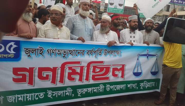 আবু সুফিয়ান পারভেজ ভূরুঙ্গামারী (কুড়িগ্রাম): কুড়িগ্রামের ভূরুঙ্গামারীতে ৩৬ জুলাই (৫ আগস্ট ) ছাত্র-জনতার গণঅভ্যুত্থানের প্রথম বর্ষপূর্তি উপলক্ষে বিশাল গণমিছিল ও সমাবেশ করেছে বাংলাদেশ জামায়াতে ইসলামী উপজেলা শাখা। মঙ্গলবার আসরের নামাজের পর ভূরুঙ্গামারী পাইলট সরকারি উচ্চ বিদ্যালয় মাঠ থেকে গণ মিছিলটি শুরু হয়ে শহরের প্রধান প্রধান সড়ক প্রদক্ষিন করে কেন্দ্রীয় বাসষ্টেশনে এসে পথসভার মাধ্যমে শেষ হয়।