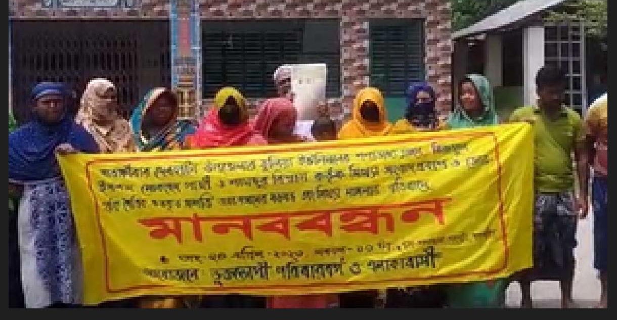 এ ঘটনার প্রেক্ষিতে সোমবার (২৪ এপ্রিল) সকাল ১০টার দিকে ওই জমির ওপর দাঁড়িয়ে মানববন্ধনে এসব দাবি করেন ভুক্তভোগী পরিবারবর্গ ও এলাকাবাসী। এ দিকে মানববন্ধন চলাকালীন তাদের রেকর্ডকৃত জমিতে ছামছুর বিশ্বাসের নেতৃত্বে কিছু লাঠিয়ালবাহিনীকে বেড়িবাঁধ দিতেও দেখা যায়।