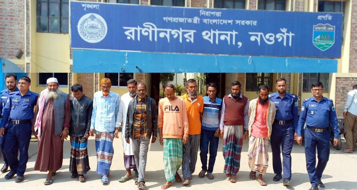 রাণীনগর থানার ওসি আবুল কালাম আজাদ বলেন, বৃহস্পতিবার রাতে উপজেলার বিভিন্ন এলাকায় অভিযান পরিচালনা করা হয়। এসময় বিভিন্ন মামলায় আদালতের পরোয়ানামূলে উপজেলার সরিয়া গ্রামের ওয়াজেদ মন্ডলের সুলতান মন্ডল(৪৩), আশরাফ আলী মন্ডলের ছেলে এনামুল মন্ডল (৪৫), আকবর আলী মন্ডলের ছেলে সফুর মন্ডল (৪২), এনামুল মন্ডলের ছেলে মামুন মন্ডল (২৫), মৃত মমতাজ উদ্দিন মন্ডলের ছেলে নুরনবী মন্ডল (৩৭) ও নুহ মন্ডল (৩৬) এবং উপজেলার মধ্যরাজাপুর গ্রামের মৃত সাইফর শেখের ছেলে জুয়েল শেখ(২২), তছির মন্ডলের ছেলে আসলাম মন্ডল (৩২) ও মৃত জফির শেখের ছেলে জলিল শেখ(৩৬) কে গ্রেপ্তার করা হয়।