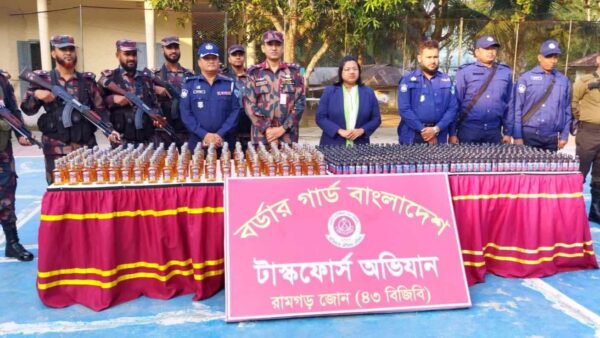 শ্রুক্রবার(২২ ডিসেম্বর) ভোর রাতে রামগড় ৪৩ বিজিবির অধিনায়ক লে.কর্ণেল আবু বকর সিদ্দিক সাইমুম এর নেতৃত্বে উপজেলা নির্বাহী অফিসার মিস.মমতা আফরিন ও থানার ওসি দেব প্রিয় দাস এর সমন্বয়ে গঠিত টাস্কফোর্স কমিটির বিশেষ অভিযানে মদ ও ফেনসিডিল জব্দ করা হয়। গোপন সংবাদের ভিত্তিতে মন্দির ঘাট এলাকায় অভিযান চালায় টাস্কফোর্স টিম। এসময় টাস্কফোর্সের উপস্থিতি টের পেয়ে মালামাল রেখে চোরাকারবারীরা পালিয়ে যায়। এরপর মালিকবিহীন ১৯২ বোতল মদ ও ৪৯৮ বোতল ফেনসিডিল জব্দ করা হয়,যার সর্বমোট আনুমানিক বাজারমূল্য ৪ লক্ষ ৮৭ হাজার তিনশত টাকা। মদ ও ফেনসিডিল ধ্বংস করার জন্য বিজিবির ব্যাটালিয়ন সদর দপ্তরে জমা রাখা হয়েছে। রামগড় উপজেলা নির্বাহী অফিসার মিস. মমতা আফরিন জানান, টাস্কফোর্সের মাদকবিরোধী অভিযান নিয়মিত চলবে। ভবিষ্যতে রামগড় কে মাদকমুক্ত করতে সকলের সহযোগিতা কামনা করছি।