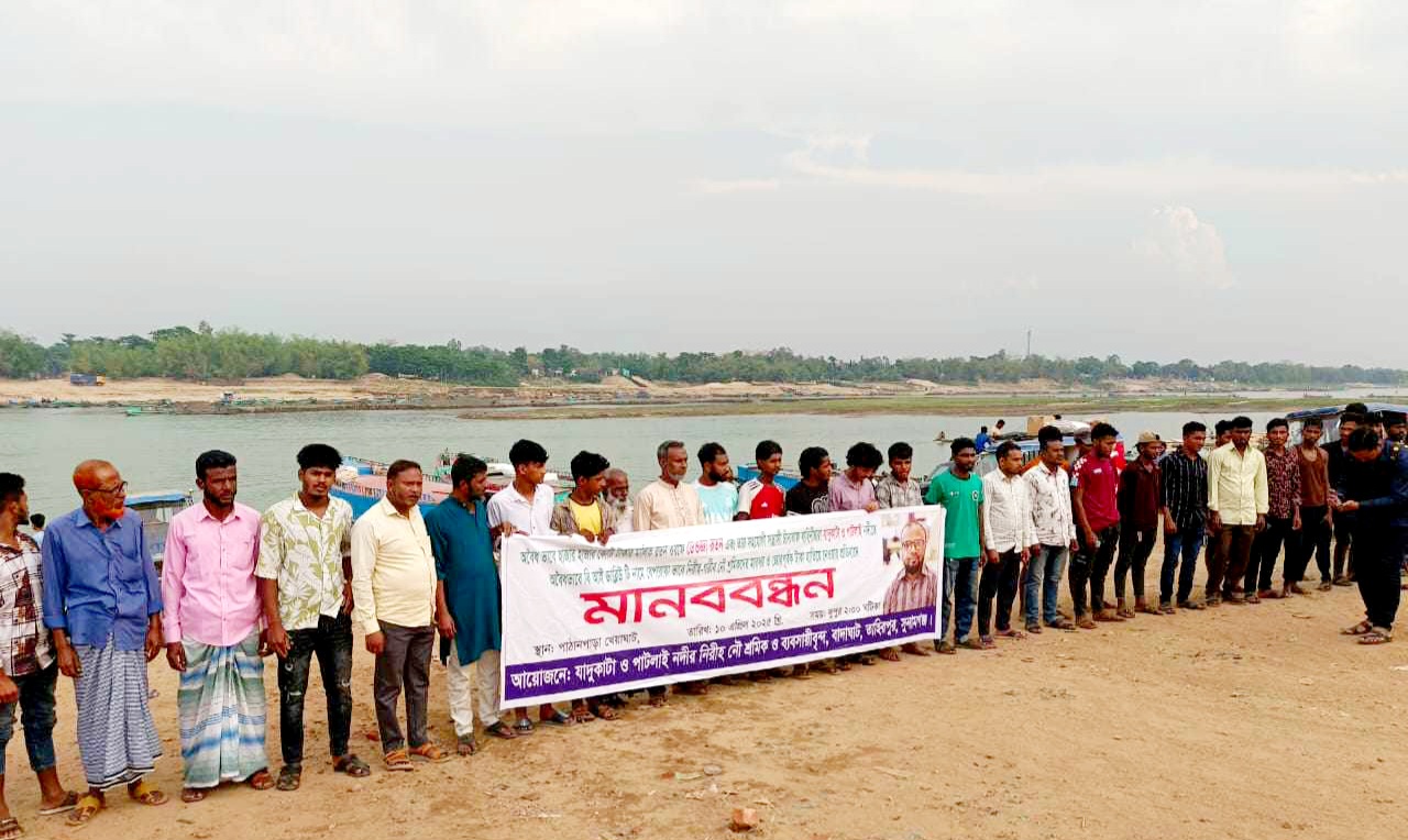 এর প্রতিবাদে মানববন্ধন করে যাদুকাটা ও পাটলাই নদীর নিরীহ নৌ-শ্রমিক ও ব্যবসায়ীবৃন্দ।