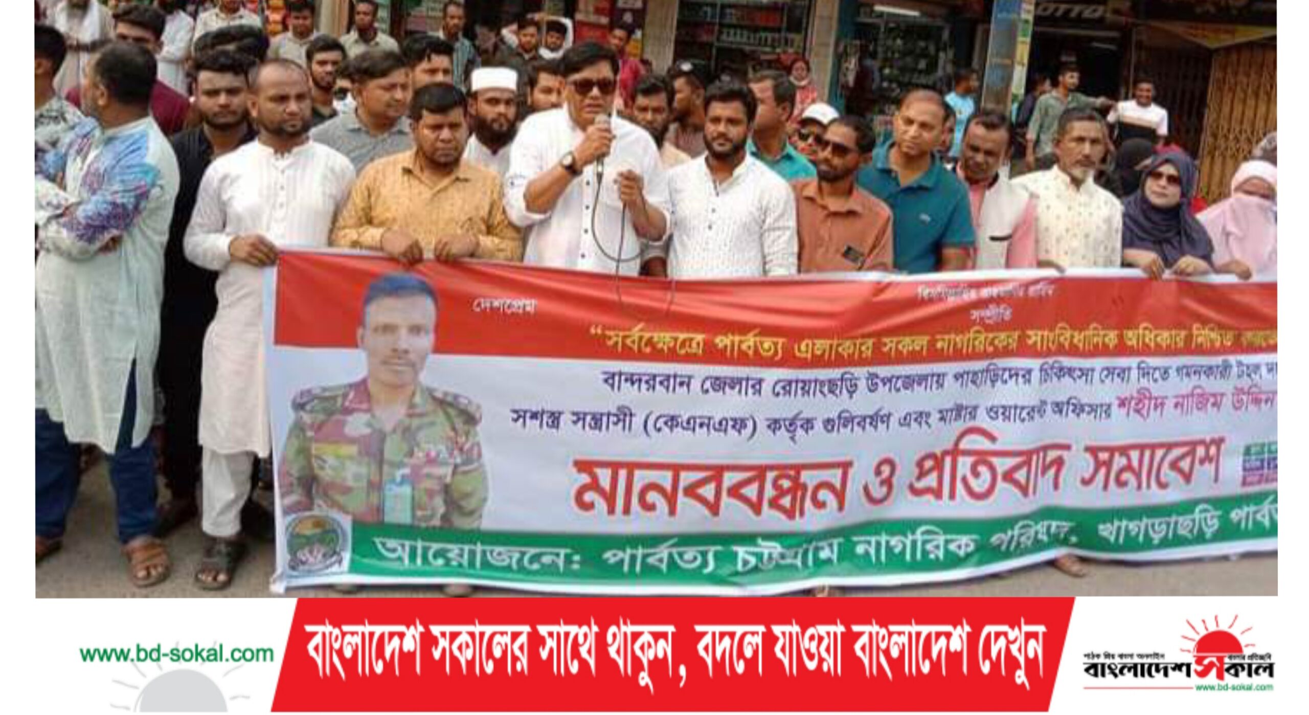 মোঃ মাসুদ রানা, খাগড়াছড়ি॥ বান্দরবান জেলার রোয়াংছড়ি উপজেলায় নিরিহ ও চিকিৎসা সেবা থেকে বঞ্চিত পাহাড়িদের চিকিৎসা সেবা দিতে গমনকারী টহল দলের উপর পাহাড়ের আঞ্চলিক সশস্ত্র সন্ত্রাসী সংগঠন (কেএনএফ) কর্তৃক গুলিবর্ষণ এবং সেনাবাহিনীর মাষ্টার ওয়ারেন্ট অফিসার শহীদ নাজিম উদ্দিন”কে হত‍্যার প্রতিবাদে পার্বত্য চট্টগ্রাম নাগরিক পরিষদ খাগড়াছড়ি জেলা শাখার উদ্যোগ মানববন্ধন ও প্রতিবাদ সভা অনুষ্ঠিত হয়েছে। ১৭ মার্চ শুক্রবার বিকেল ৩ ঘটিকার সময় খাগড়াছড়ি শহর শাপলা চত্বরে এই মানববন্ধন অনুষ্ঠিত হয়।