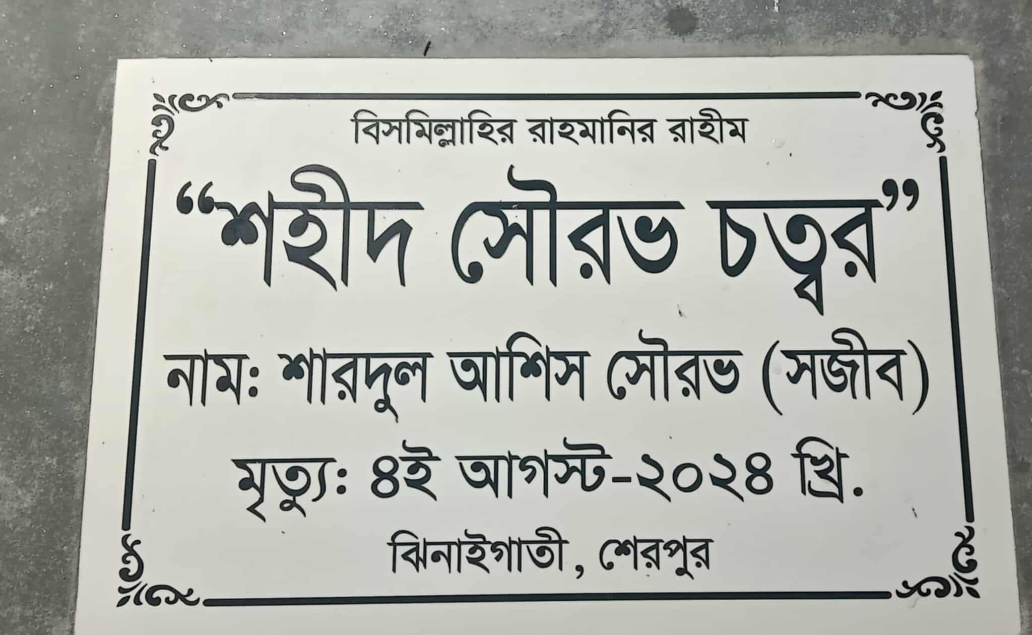 ৫ আগস্ট, মঙ্গলবার সকালে ঝিনাইগাতী থানা মোড়ে শহীদ ছাত্রনেতা সৌরভের নামে নির্মিত ‘সৌরভ চত্বর’-এর মোড়ক উন্মোচন করেন, ইউএনও মো. আশরাফুল আলম রাসেল। এ সময় শহীদ সৌরভের পিতা, থানা ভারপ্রাপ্ত কর্মকর্তা (ওসি) মো. আল আমিন, জনপ্রতিনিধি, শিক্ষক, সাংবাদিকসহ নানা শ্রেণি-পেশার মানুষ উপস্থিত ছিলেন।